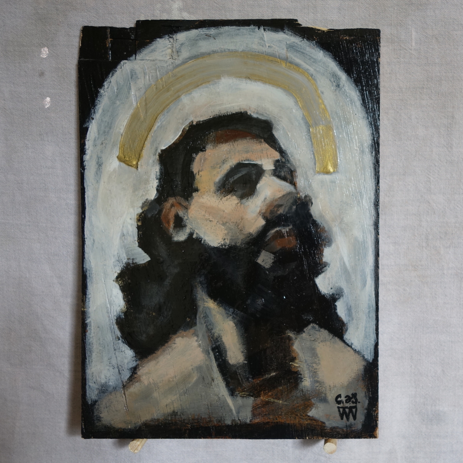 You paint a lot of religious art. Talk about how you approach these pieces. That’s an interesting question, because I don’t think that my output of religious work is that significant. About five years ago I did paintings for a woman who was self-publishing a book titled “Portrait of a Woman and Jesus.” The bulk of my religious work is comprised in this group of paintings. This project was closely directed as she had a fairly specific vision of what she wanted. We worked well together and I was honored that she considered me an answer to her prayers. When creating these pieces and others, it is always important to know what the parameters are, that I need to work within. Personal connection is important to me so I do my best to empathize with the subject matter and imagine myself as a participant of the scene being painted. This may sound a bit sentimental, but I am careful to select the music and media I listen to or watch during the process. I think that the emotional content on the faces of the figures has always been an emphasis to me regardless of subject matter, so being keen to this is natural. Sketches are created and are approved, rejected, or adjusted. Depending on the complexity of the project, color studies are executed. The final paintings are then, again, approved, adjusted, and (unfortunately) sometimes rejected. The religious paintings that I have done for myself are a bit more difficult, because they are under the standard of my own personal vision and expectation, which may evolve and expand during the creation process. These paintings generally are started with a few rough sketches and resource materials with limited planning. There are quite a bit of changes in a process of this nature, yet in the end I find the journey with these projects much more satisfying than otherwise.